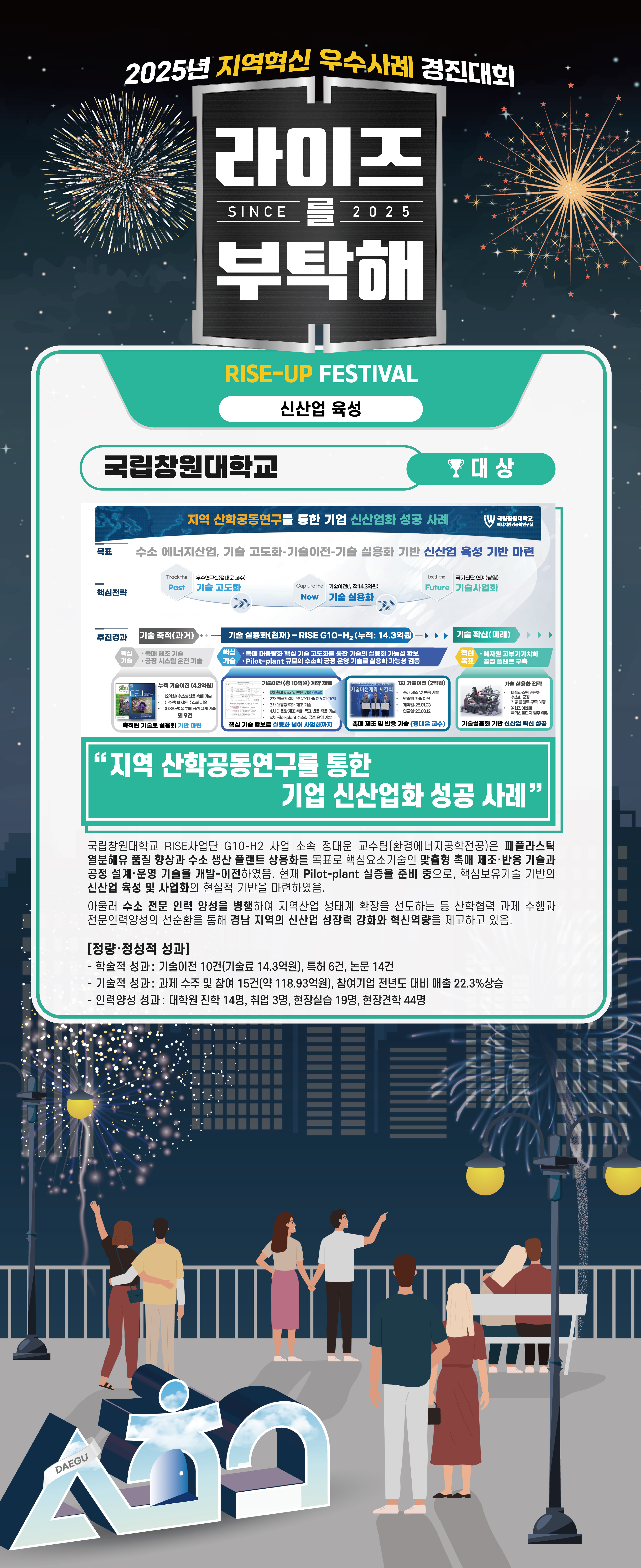 이 수상작은 국립창원대학교가 주도하여 산학협력 과제를 수행하고 전문 인력을 체계적으로 양성하는 선순환 구조를 통해 경남 지역의 핵심 신산업인 수소산업의 성장력 강화와 혁신역량 제고에 실질적으로 앞장선 성과를 높이 평가 받았다.