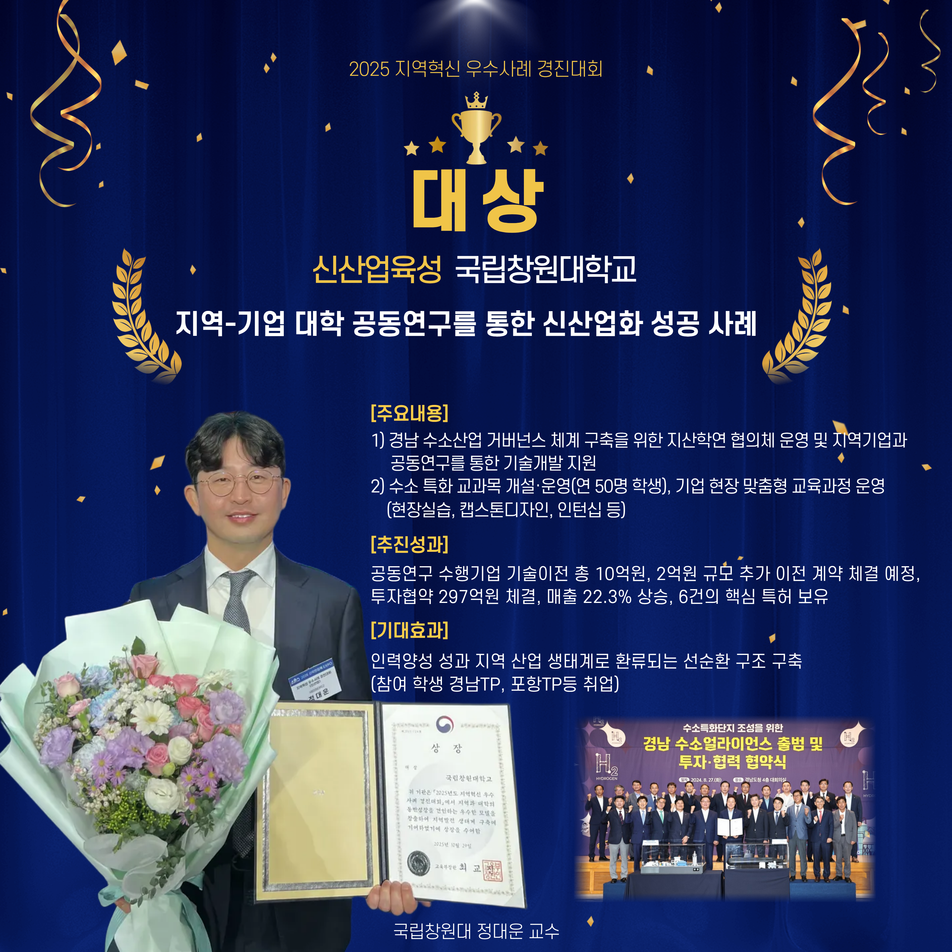 [ 대상 수상의 영예를 안은 국립창원대학교 정대운 교수. 정 교수팀은 '지역-기업 대학 공동연구를 통한 신산업화 성공 사례'로 2025 지역혁신 우수 사례 경진대회 대상을 수상했다.]